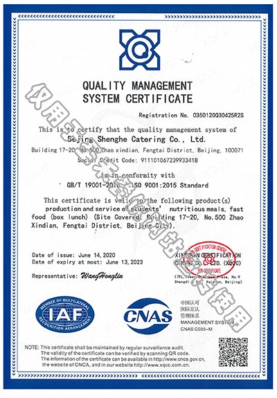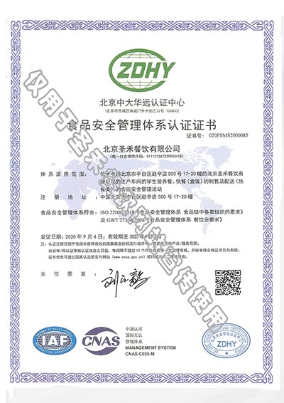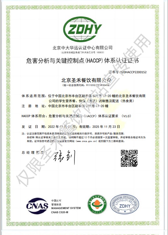 学生营养送餐HACCP管理体系验收证书